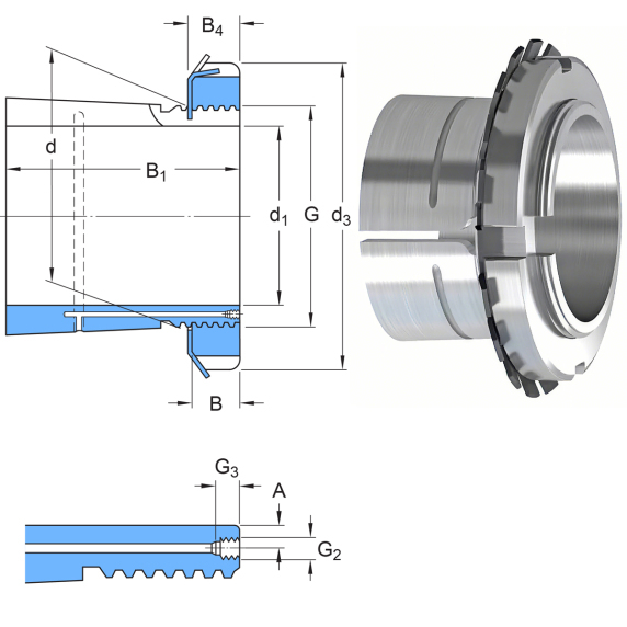 • B: Locking bushing suitable for oil injection: one or two oil supply pipes at the end opposite to the threaded part; Locking bushing for inch shafts: Whitworth thread